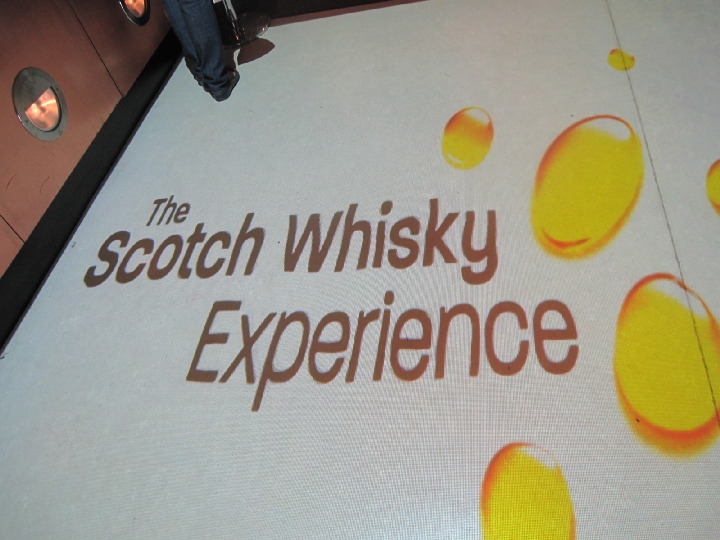 チケットブースの前、入口の床。"Scotch Whisky Experience"の文字が映しだされてる。
