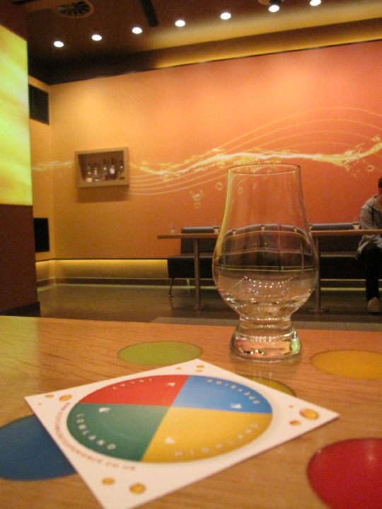 展示を見終わったら試飲のコーナーへ。手前の4色のカードはスコットランドの各地域のウィスキーの香りの違いを試せるもの。各色の部分をめくるとそれぞれのウィスキーの特徴的な香りがして、自分の好みのものを試飲させてもらえるというシステム。
