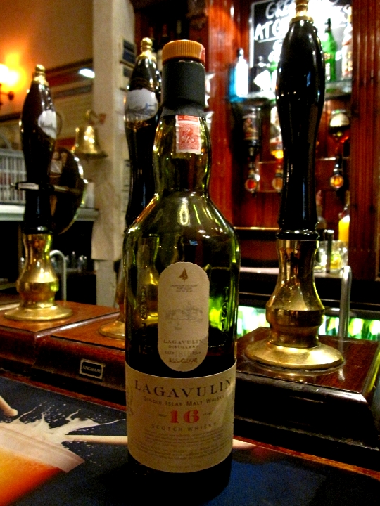 どれがいいとかわからないのでボトル見てバーテンダーに聞きながら注文。これはバーテンダーおすすめのアイラモルトで、”LAGABULIN”(ラガブーリン)という蒸留所のもの。