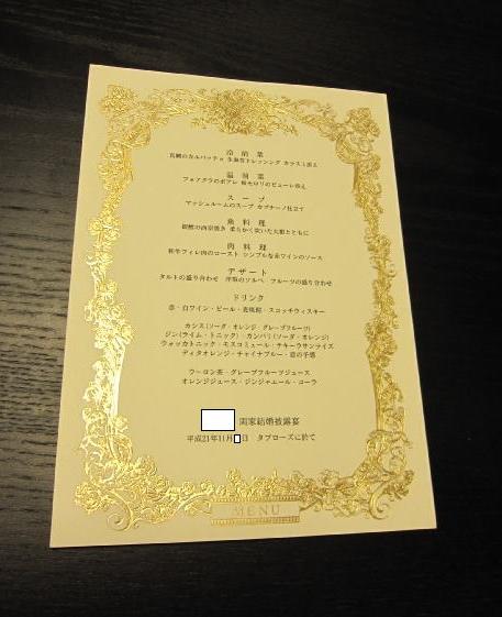 ゲストに配るメニューは普通コースの内容しか書かないんですが、どうしてもドリンクメニューも作りたかった私。プランナー嬢(美女、癒し系、仕事できる)の力を借りて無事に実現しました。