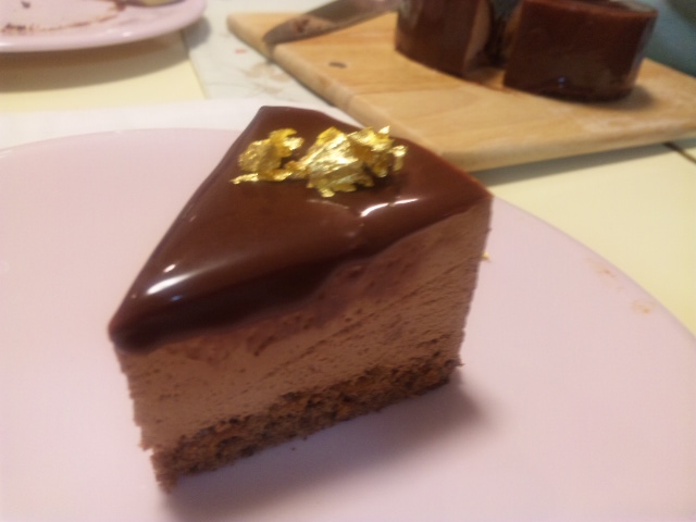 メニューは「ムース・ジャンドゥーヤ」。ジャンドゥーヤというのはヘーゼルナッツ風味のチョコレートのことだそうで、そのムースです。他に「ガトー・ショコラ・フランボワーズ」という木イチゴのガトーショコラのどちらかと選べたのですが、先生がオススメだとおっしゃるのでこちらを選択。