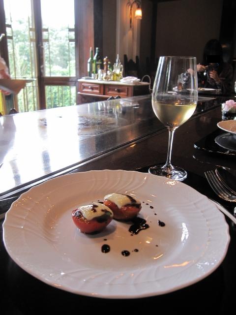 この日の季節の野菜料理は、トマトの鉄板焼きにモッツァレラチーズを乗せるというおいしいに決まってるじゃないかというメニュー。